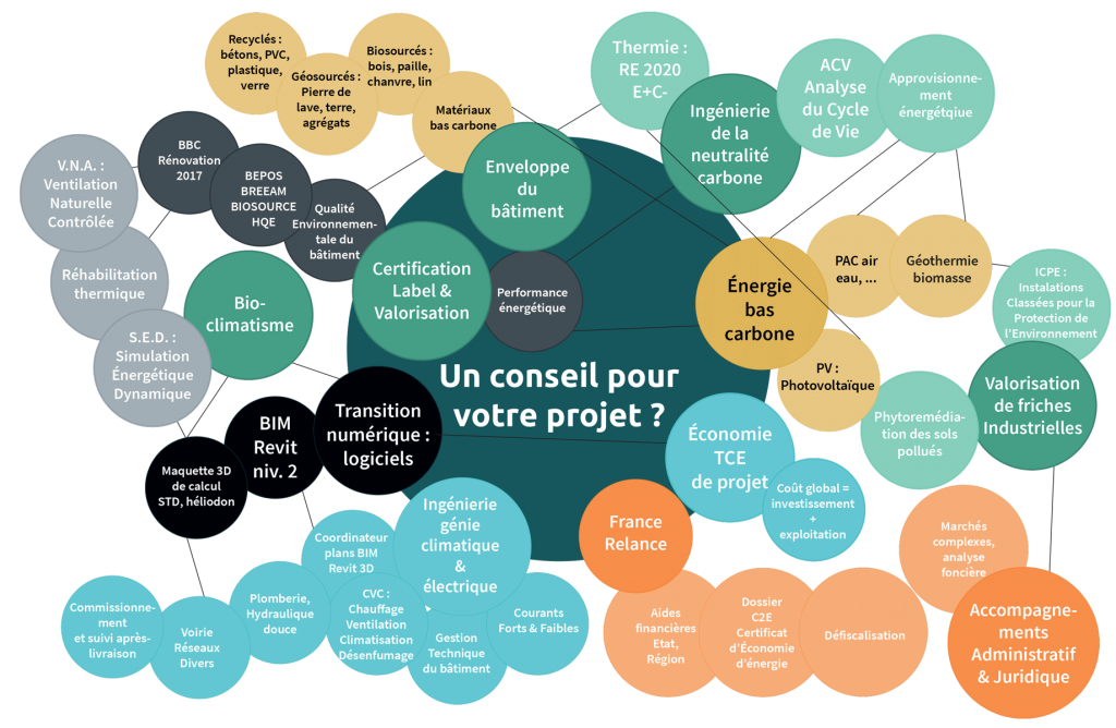 Ce pôle Analyse aussi le Cycle de Vie (ACV) de votre projet en optimisant le poids carbone. Nous vous guidons pour respecter le « décret Tertiaires » dans vos bâtiments existants, et auditer et diagnostiquer ceux-ci.